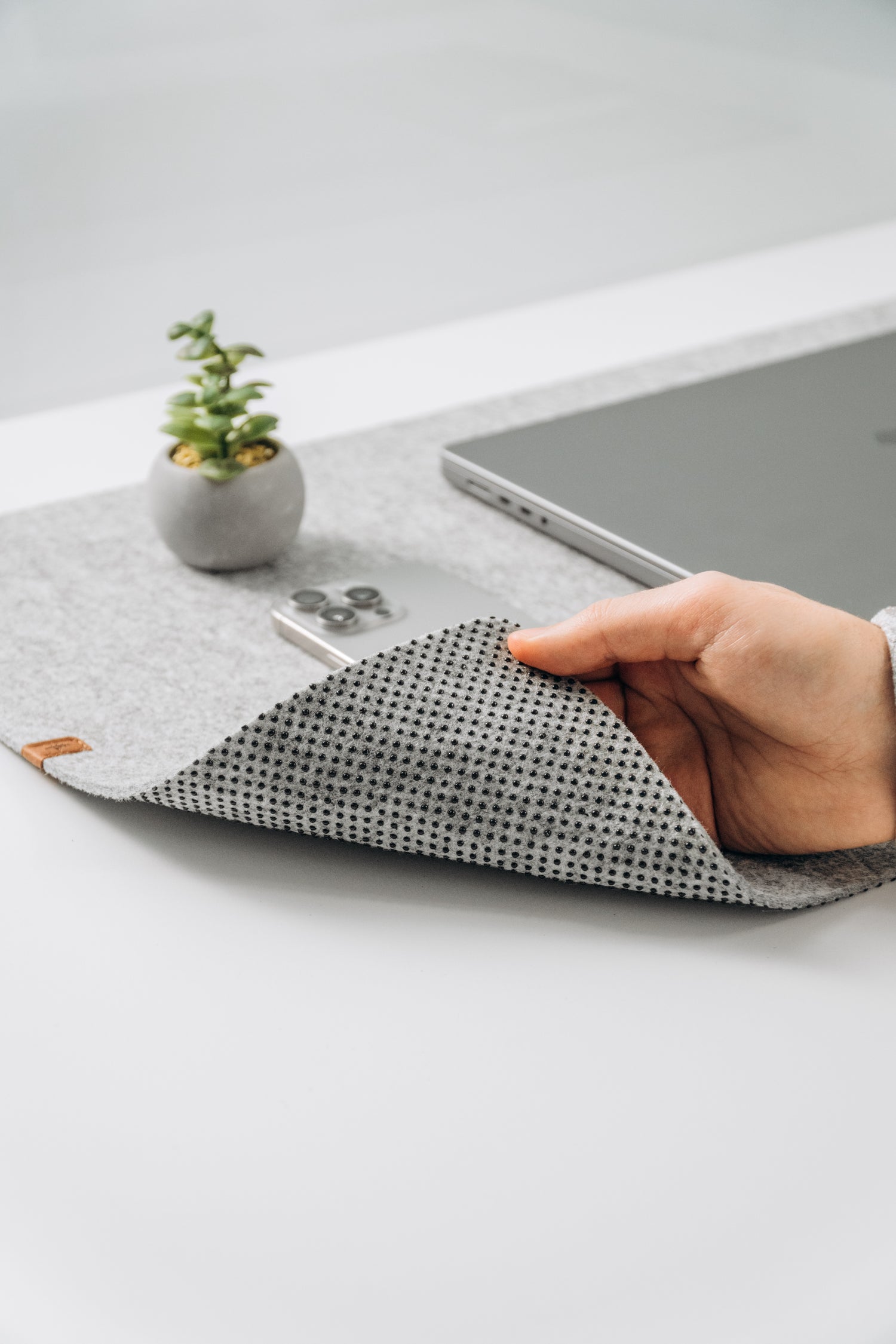 Our premium felt desk mat features a sophisticated leather logo tab that adds a touch of refined elegance to your workspace. This subtle detail symbolizes our commitment to quality and design.